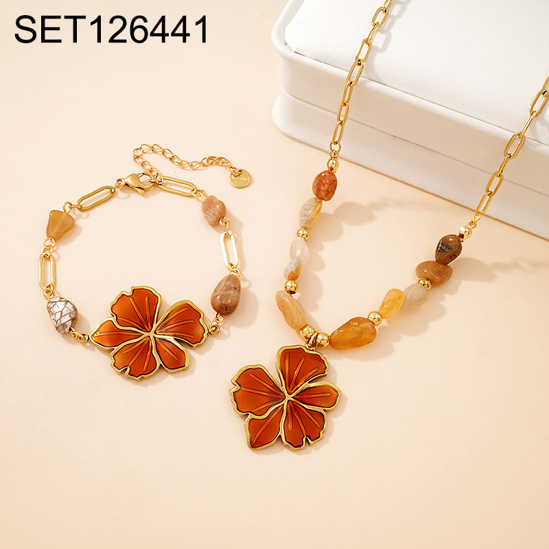 Level B Stainless Steel New Trendy Women Jewelry Drip Oil/Enamel Flower Golden Chain SET