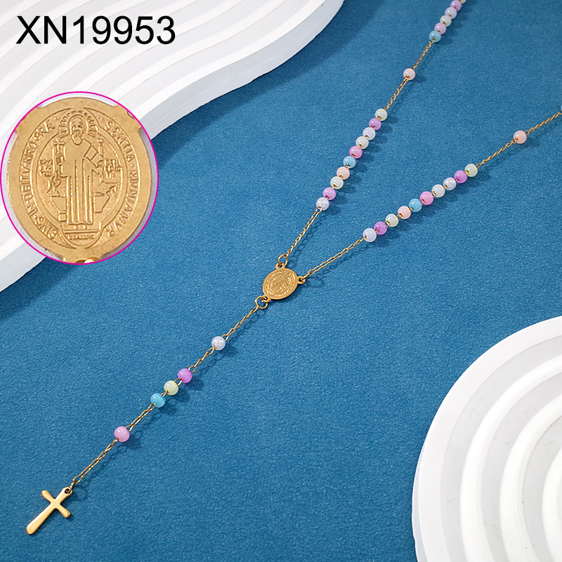Level B Stainless Steel New Trendy Women Jewelry Mixed color Bead Chain Religion Cross Golden Necklace