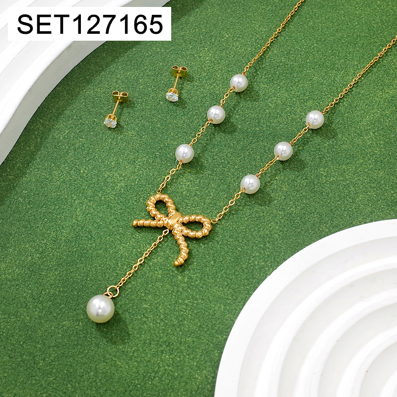 Level B Stainless Steel New Trendy Women Jewelry Pearl Style/Plastic Beads Bowknot Golden SET