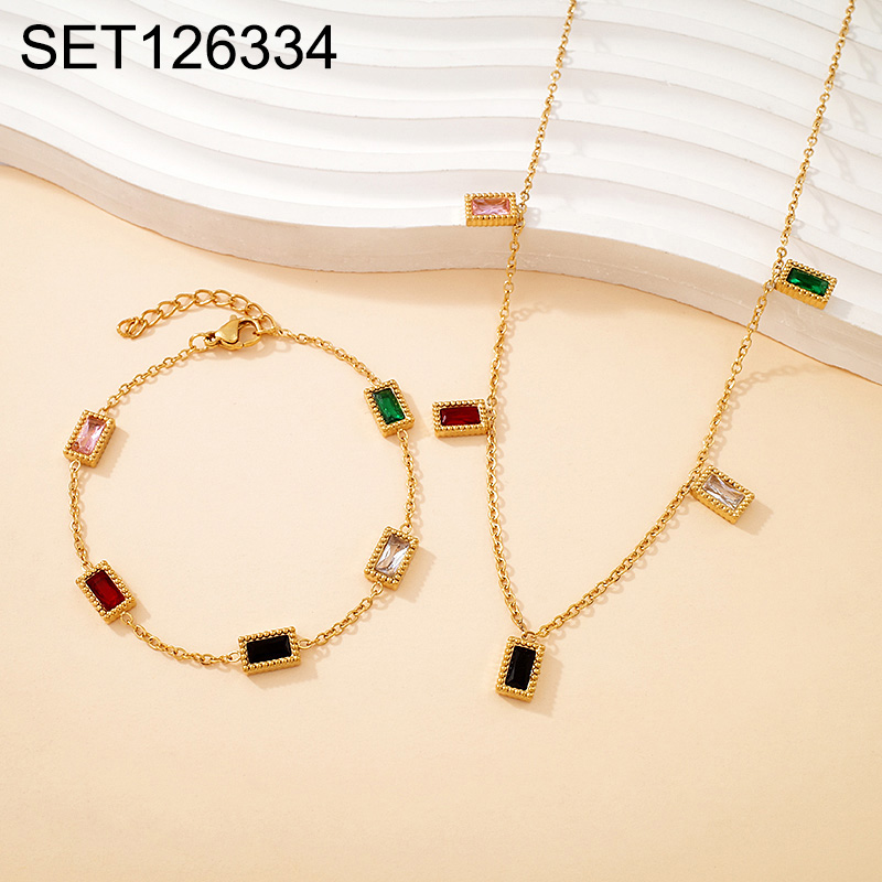Home > Level B Stainless Steel New Trendy Women Jewelry Rectangle Mixed color Crystal zirconium Golden Chain SET