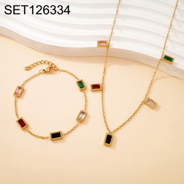 Level B Stainless Steel New Trendy Women Jewelry Rectangle Mixed color Crystal zirconium Golden Chain SET