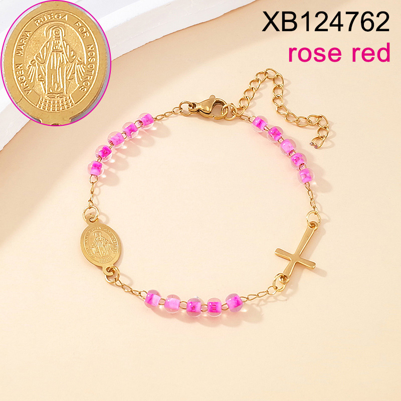 Level B Stainless Steel New Trendy Women Jewelry Rose red Bead Chain Religion Cross Golden Bracelet