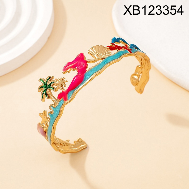 Level B Stainless Steel New Trendy Women Jewelry Summer beach Tree Mermaid Animal Shell Golden Open Bangle;Bangle size can be adjusted freely