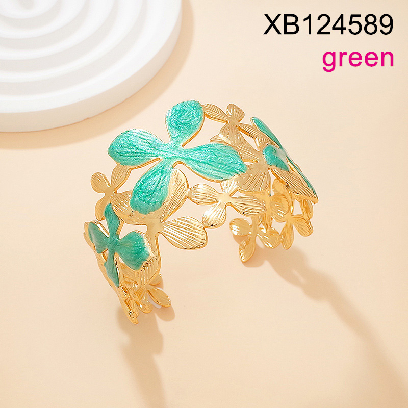 Level C Stainless Steel New Trendy Women Jewelry Drip Oil/Enamel Flower Golden Open Bangle;Bangle size can be adjusted freely