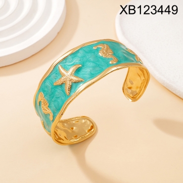 Level C Stainless Steel New Trendy Women Jewelry Drip Oil/Enamel Summer beach Animal Starfish Seahorse Golden Open Bangle;Bangle size can be adjusted freely