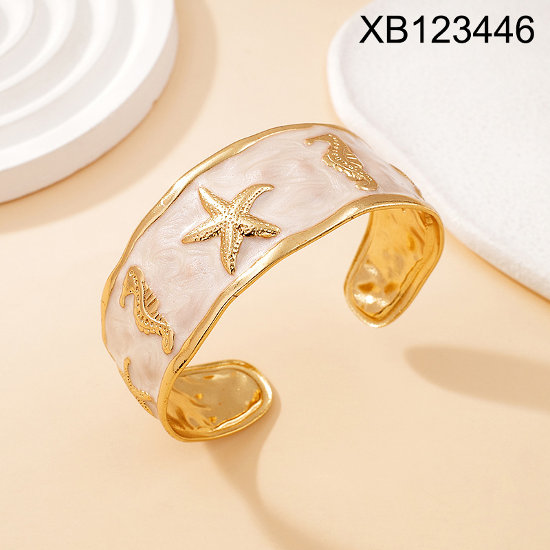 Level C Stainless Steel New Trendy Women Jewelry Drip Oil/Enamel Summer beach Animal Starfish Seahorse Golden Open Bangle;Bangle size can be adjusted freely