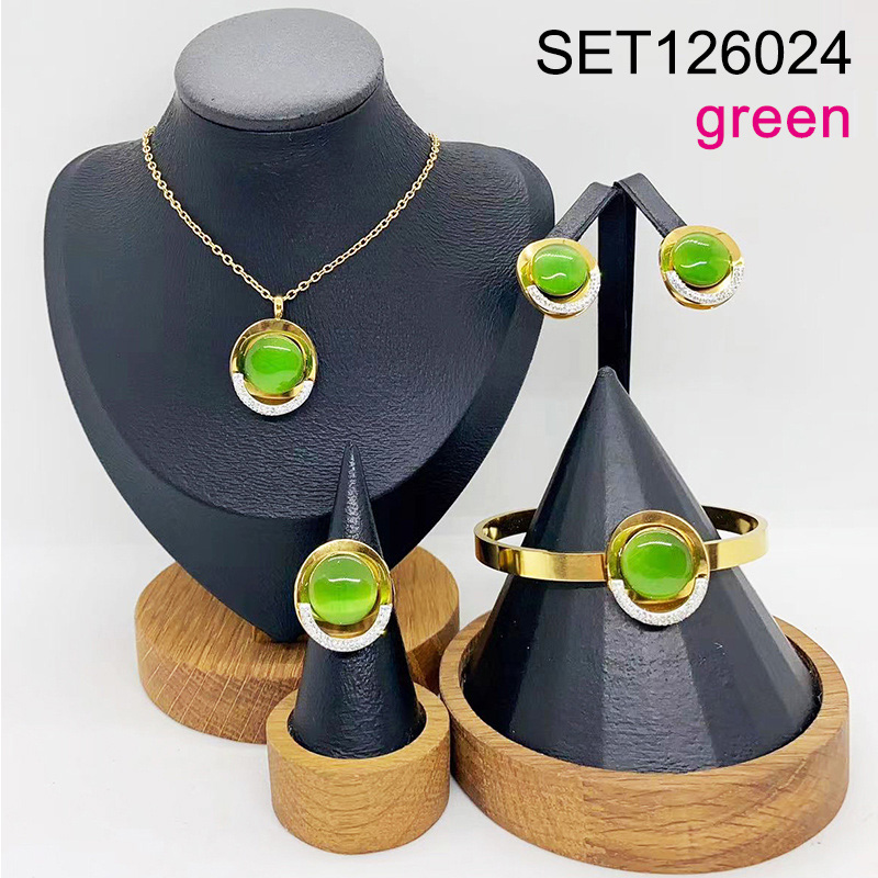 Level B Stainless Steel New Trendy Women Jewelry Round Green Opal Golden 4pcs SET