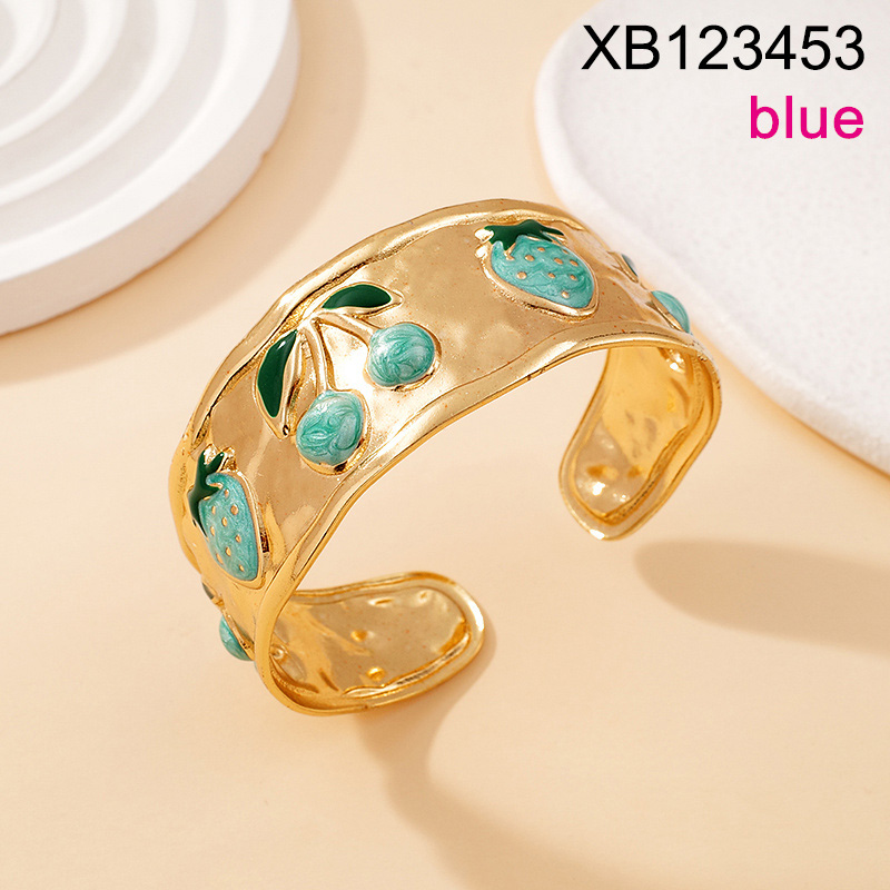 Level C Stainless Steel New Trendy Women Jewelry Drip Oil/Enamel Summer fruit style Cherry Strawberry Golden Open Bangle;Bangle size can be adjusted freely