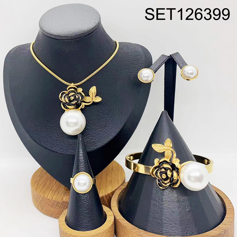 Level B Stainless Steel New Trendy Women Jewelry Pearl Style/Plastic Beads Flower Golden 4pcs SET