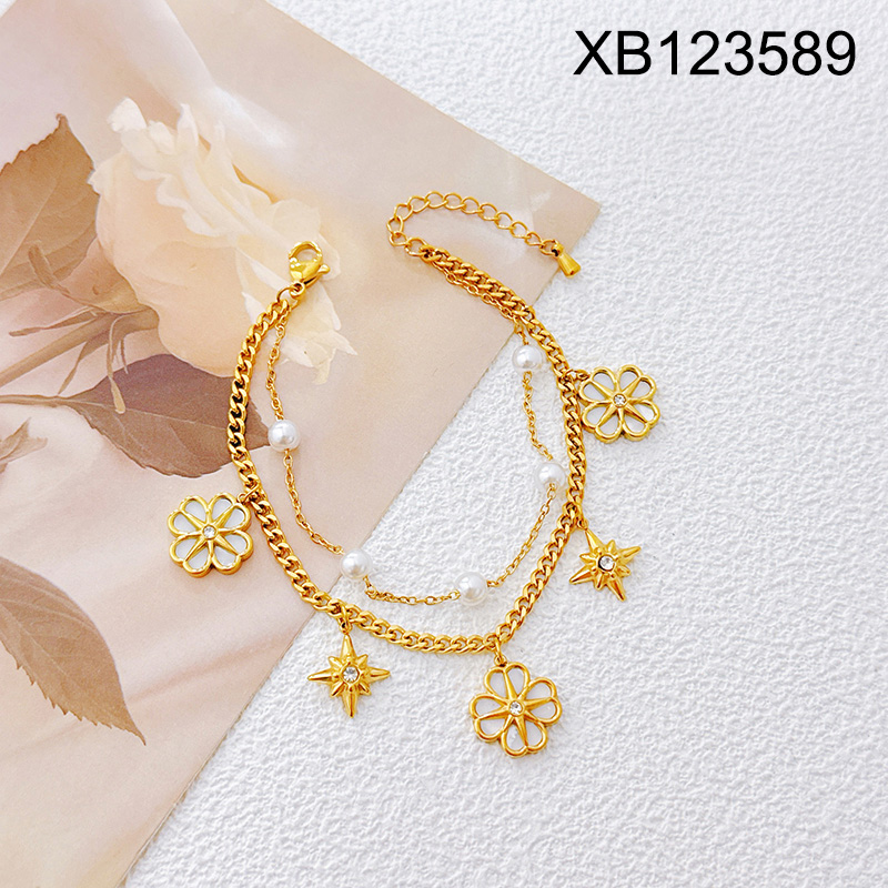 Level B Stainless Steel New Trendy Women Jewelry Pearl Style/Plastic Beads Two Layers Chain SYC Eight-Pointed Star Golden Bracelet