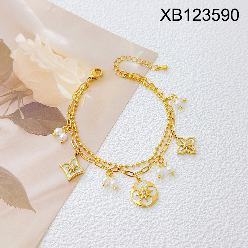 Level B Stainless Steel New Trendy Women Jewelry Pearl Style/Plastic Beads Two Layers Chain SYC Eight-Pointed Star Golden Bracelet