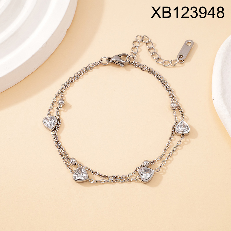 Level B Stainless Steel New Trendy Women Jewelry Two Layers Chain Heart Steel color Bracelet