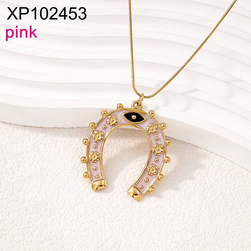 Level B Stainless Steel New Trendy Women Jewelry Drip Oil/Enamel Pink Horseshoe Golden Pendant