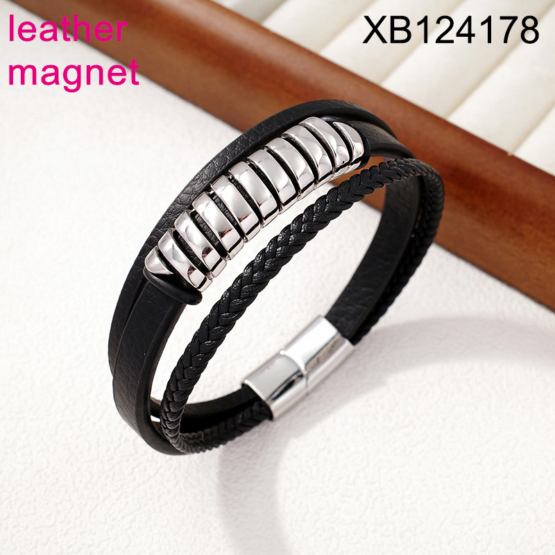 Home > Level B Stainless Steel New Trendy Man Jewelry Three Layer Chain Steel color Magnet buckle Leather Bracelet