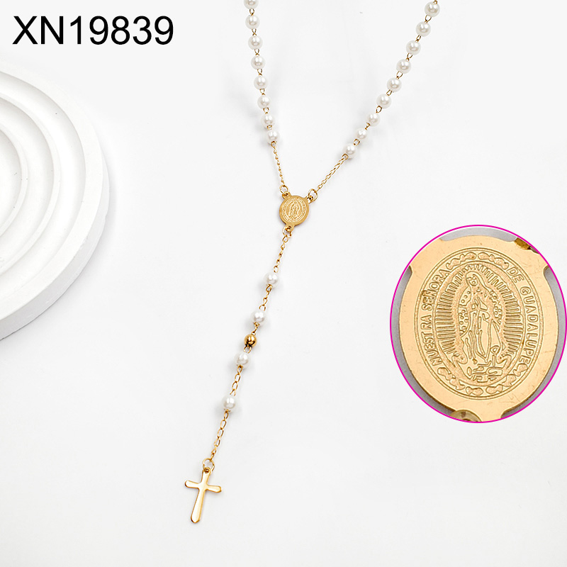 Level B Stainless Steel New Trendy Women Jewelry Pearl Style/Plastic Beads Bead Chain Religion Cross Golden Necklace