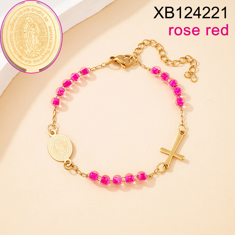 Level B Stainless Steel New Trendy Women Jewelry Rose red Bead Chain Religion Cross Golden Bracelet