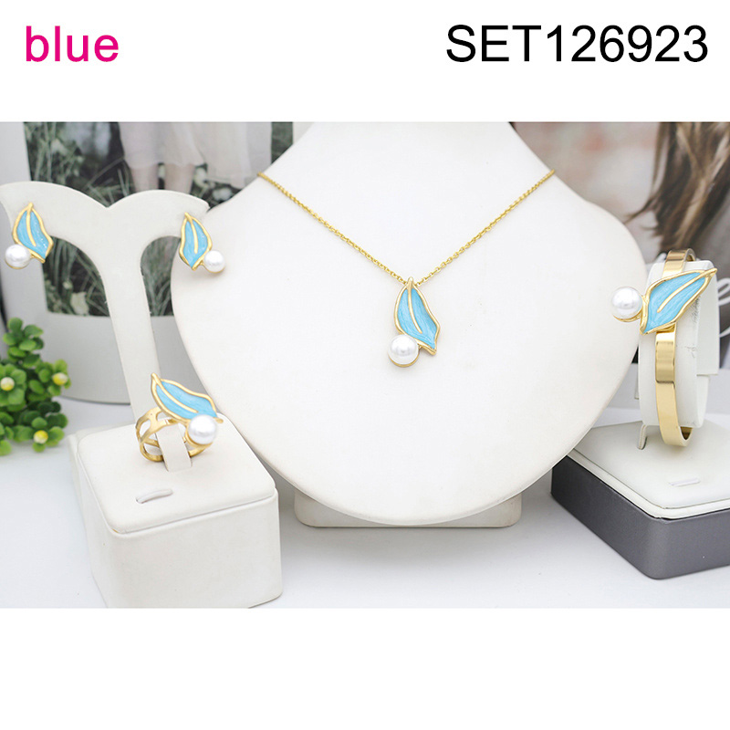 Level B Stainless Steel New Trendy Women Jewelry Pearl Style/Plastic Beads Drip Oil/Enamel Blue Leaf Golden 4pcs SET
