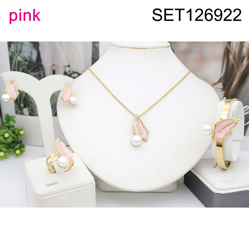 Level B Stainless Steel New Trendy Women Jewelry Pearl Style/Plastic Beads Drip Oil/Enamel Pink Leaf Golden 4pcs SET