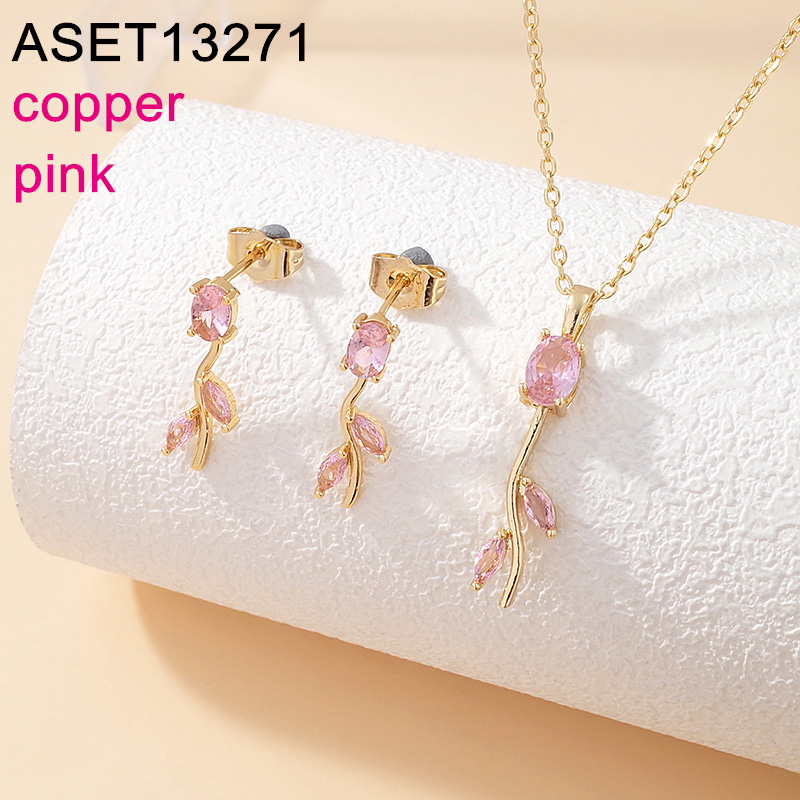 Level B Fashion Jewelry New Trendy Women Jewelry Pink Crystal zirconium Flower Golden SET;Material:copper (cobre)