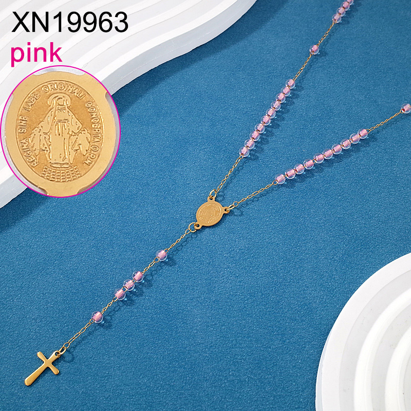 Level B Stainless Steel New Trendy Women Jewelry Pink Bead Chain Religion Cross Golden Necklace