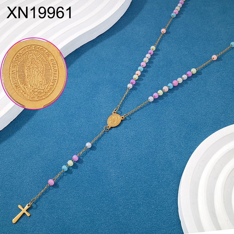Level B Stainless Steel New Trendy Women Jewelry Mixed color Bead Chain Religion Cross Golden Necklace