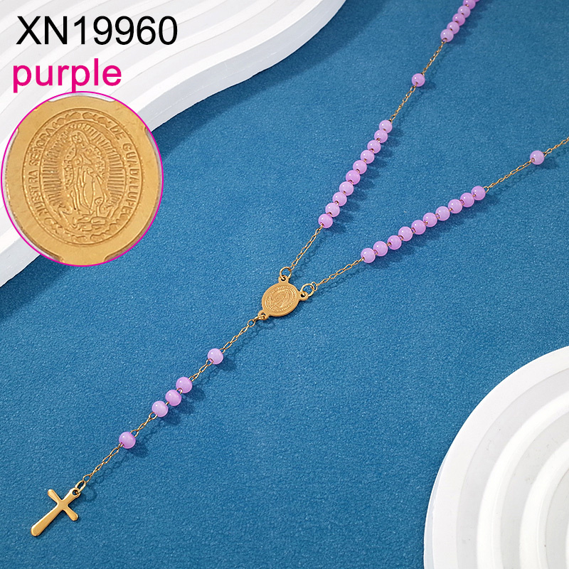Home > Level B Stainless Steel New Trendy Women Jewelry Purple Bead Chain Religion Cross Golden Necklace