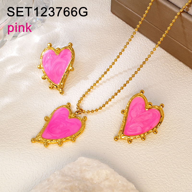 Level A Stainless Steel New Trendy Women Jewelry Drip Oil/Enamel Pink Heart Golden Valentine's Day SET