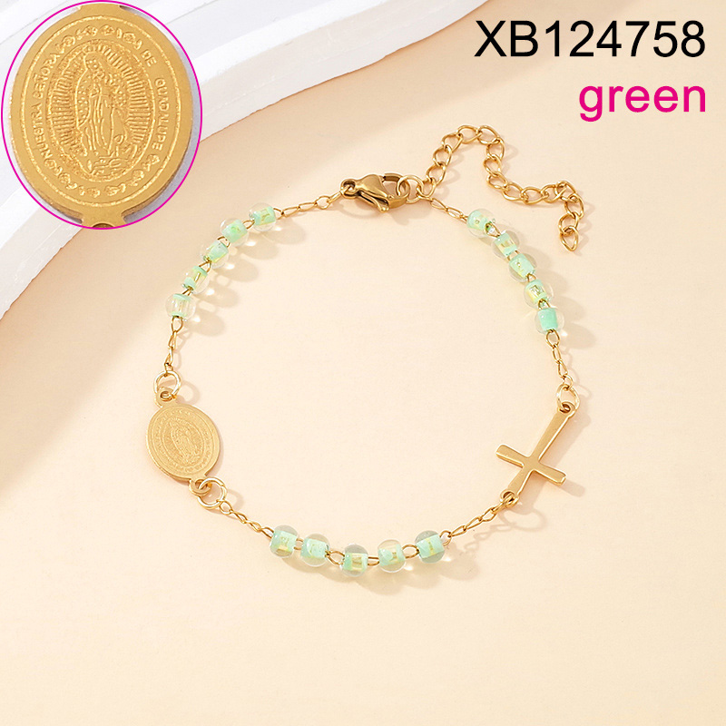 Home > Stainless Steel Bracelets > Level B Stainless Steel New Trendy Women Jewelry Green Bead Chain Religion Cross Golden Bracelet