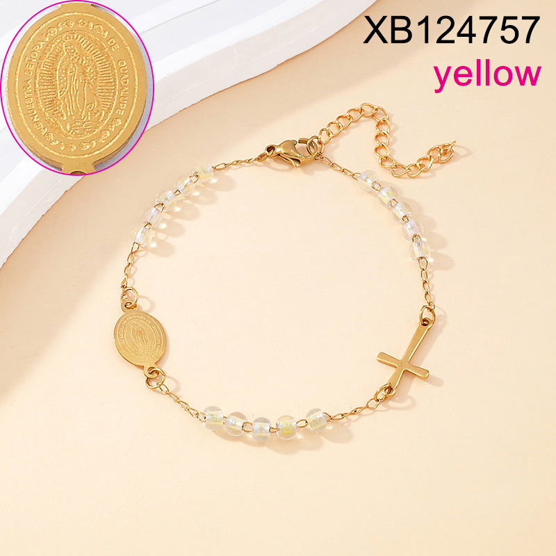 Home > Stainless Steel Bracelets > Level B Stainless Steel New Trendy Women Jewelry Yellow Bead Chain Religion Cross Golden Bracelet