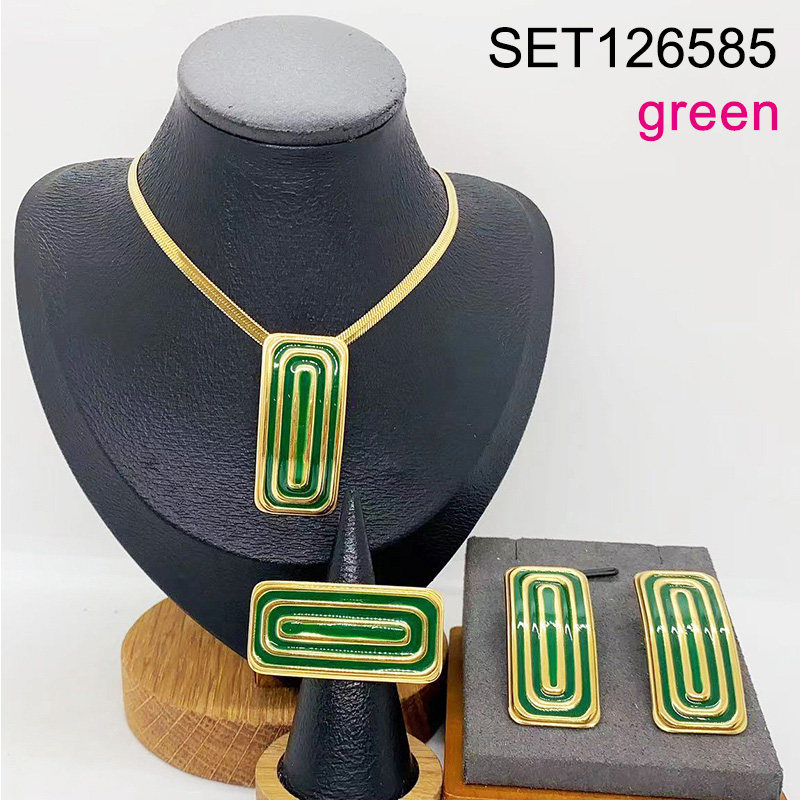 Level B Stainless Steel New Trendy Women Jewelry Drip Oil/Enamel Green Rectangle Golden 3pcs SET