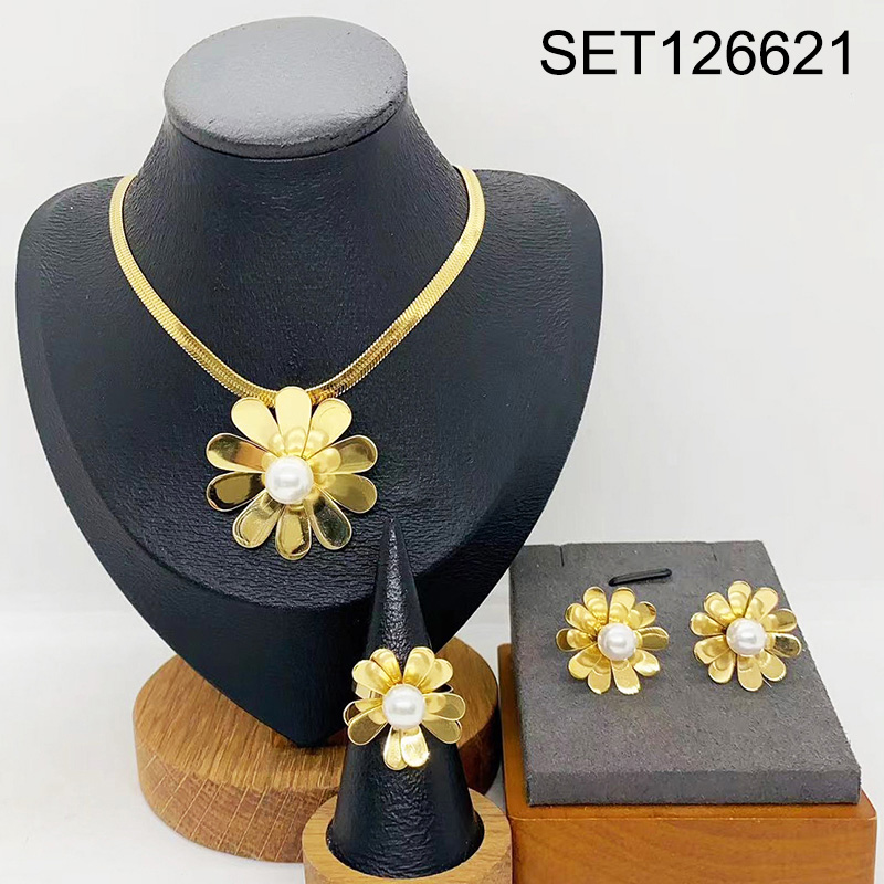 Level B Stainless Steel New Trendy Women Jewelry Pearl Style/Plastic Beads Flower Golden 3pcs SET