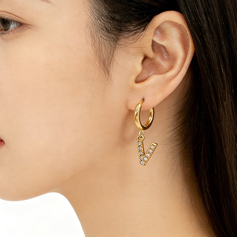 Home > Letter Jewelry > Steel Letter Earrings > Level B Stainless Steel Jewelry New Trendy Sticky Stone Letter V Golden Hoop Earring