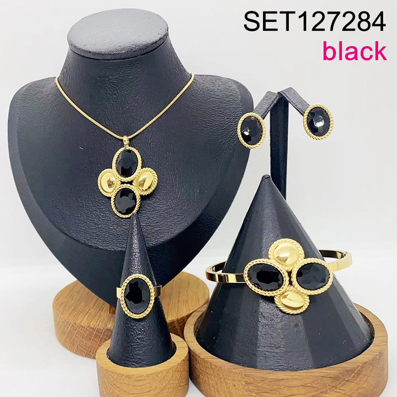 Home > Stainless Steel Sets > Hot Set Jewerly > Level B Stainless Steel New Trendy Women Jewelry Black Stone Oval Golden 4pcs SET