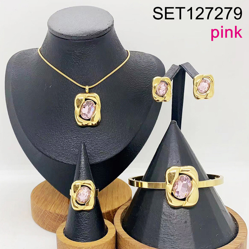 Home > Stainless Steel Sets > Hot Set Jewerly > Level B Stainless Steel New Trendy Women Jewelry Pink Stone Geometry Golden 4pcs SET