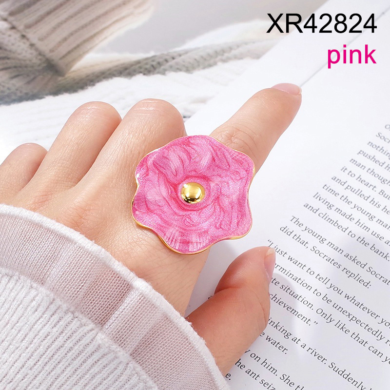 Level C Stainless Steel New Trendy Women Jewelry Drip Oil/Enamel Pink Flower Golden Open Rings;Ring size can be adjusted freely