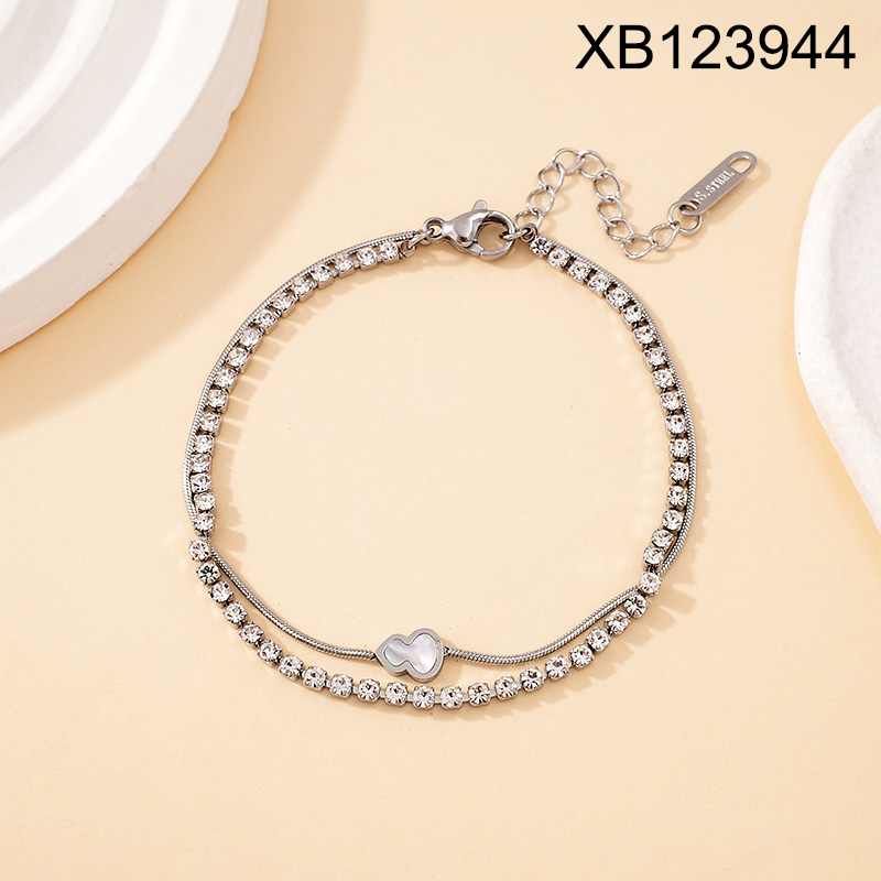 Level B Stainless Steel New Trendy Women Jewelry Two Layers Chain White Rhinestone Calabash Steel color Bracelet