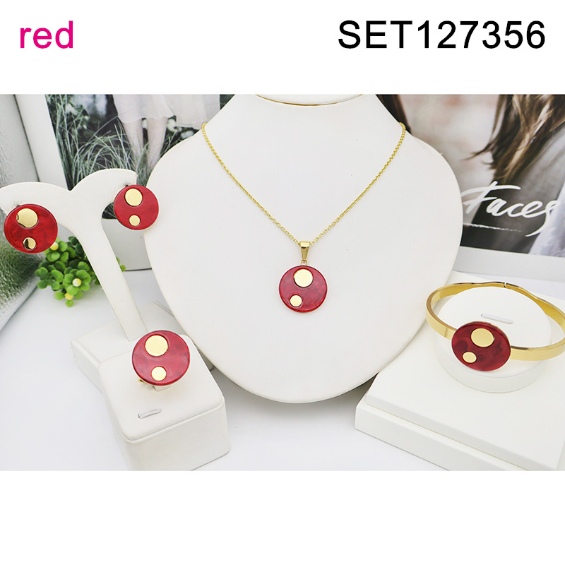 Level B Stainless Steel New Trendy Women Jewelry Red Round Resin Golden 4 pcs SET