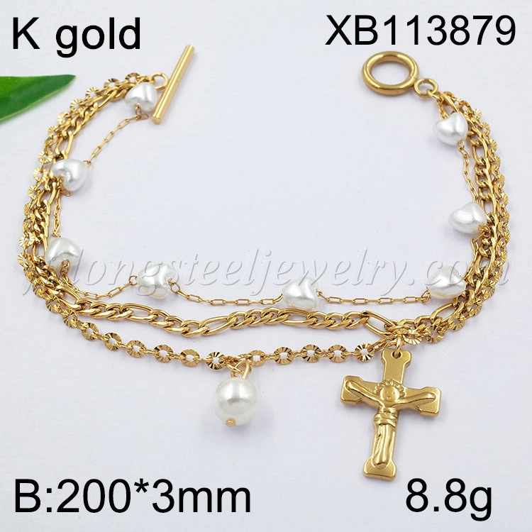 Stainless Steel Jewelry Three Layer Chain Imitation Pearl Cross Golden Bracelet