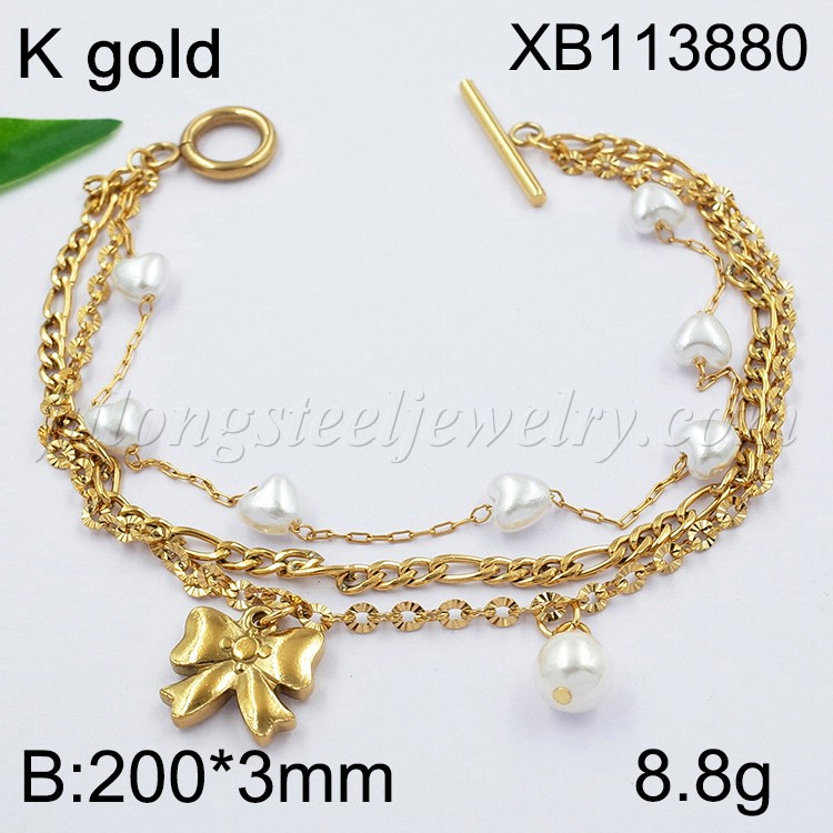 Stainless Steel Jewelry Three Layer Chain Imitation Pearl Bowknot Golden Bracelet