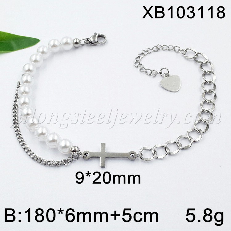 Stainless Steel Jewelry White Plastic Beads Cross Charm Chain Bracelet