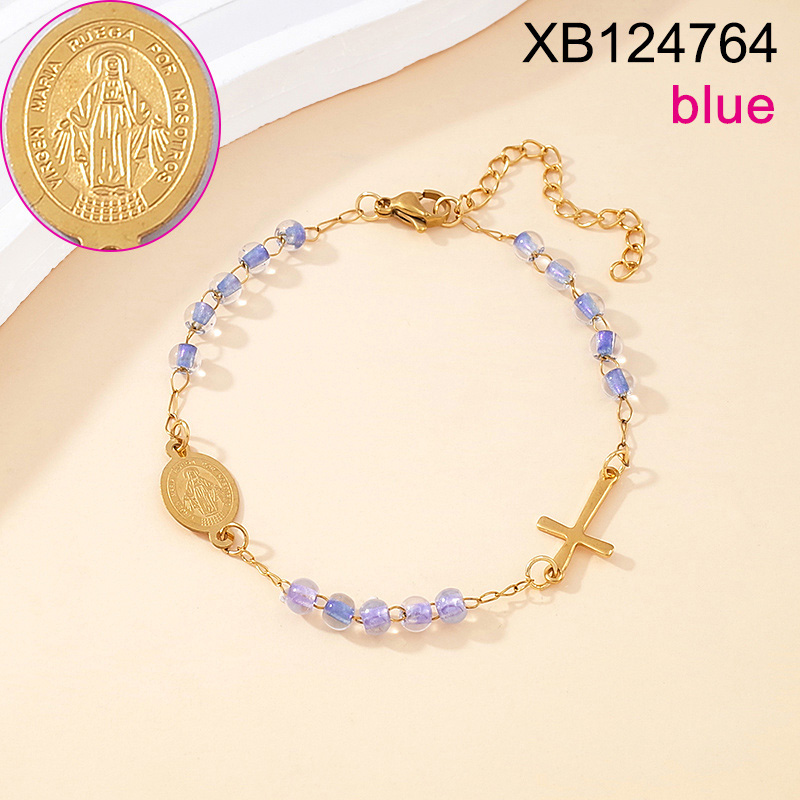 Level B Stainless Steel New Trendy Women Jewelry Blue Bead Chain Religion Cross Golden Bracelet