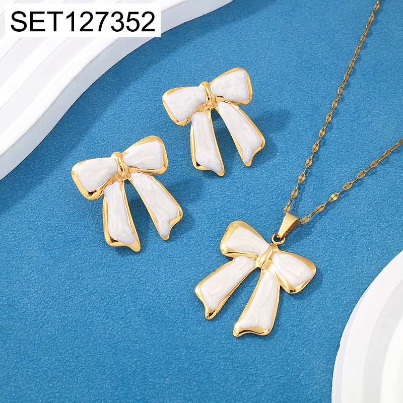 Level C Stainless Steel New Trendy Women Jewelry Pearl Style/Plastic Beads Drip Oil/Enamel White Bowknot Golden SET
