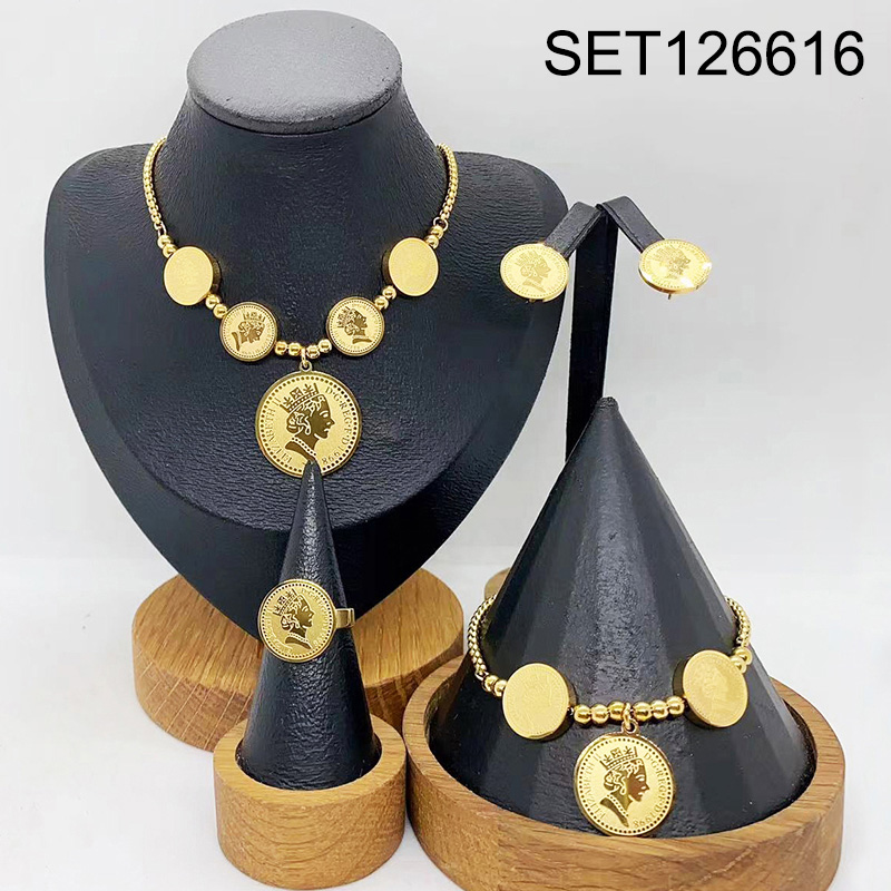 Level B Stainless Steel New Trendy Women Jewelry Queen Coin Golden 4pcs SET
