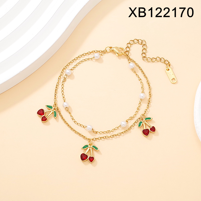 Home > Level C Stainless Steel New Trendy Women Jewelry Two Layers Chain Pearl Style/Plastic Beads Summer fruit style Cherry Golden Zircon Bracelet