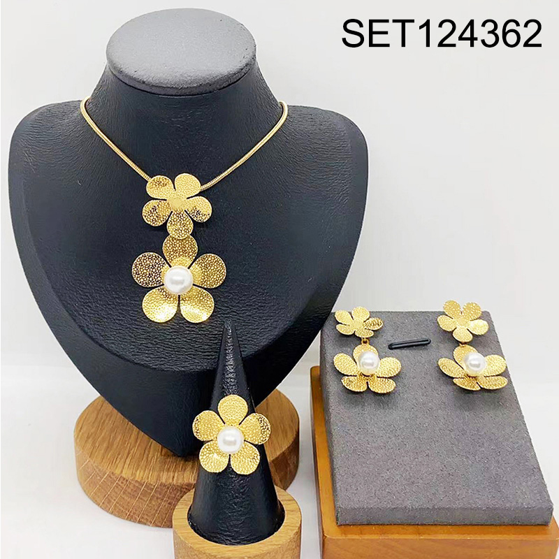 Level B Stainless Steel New Trendy Women Jewelry Pearl Style/Plastic Beads Flower Golden 3pcs SET