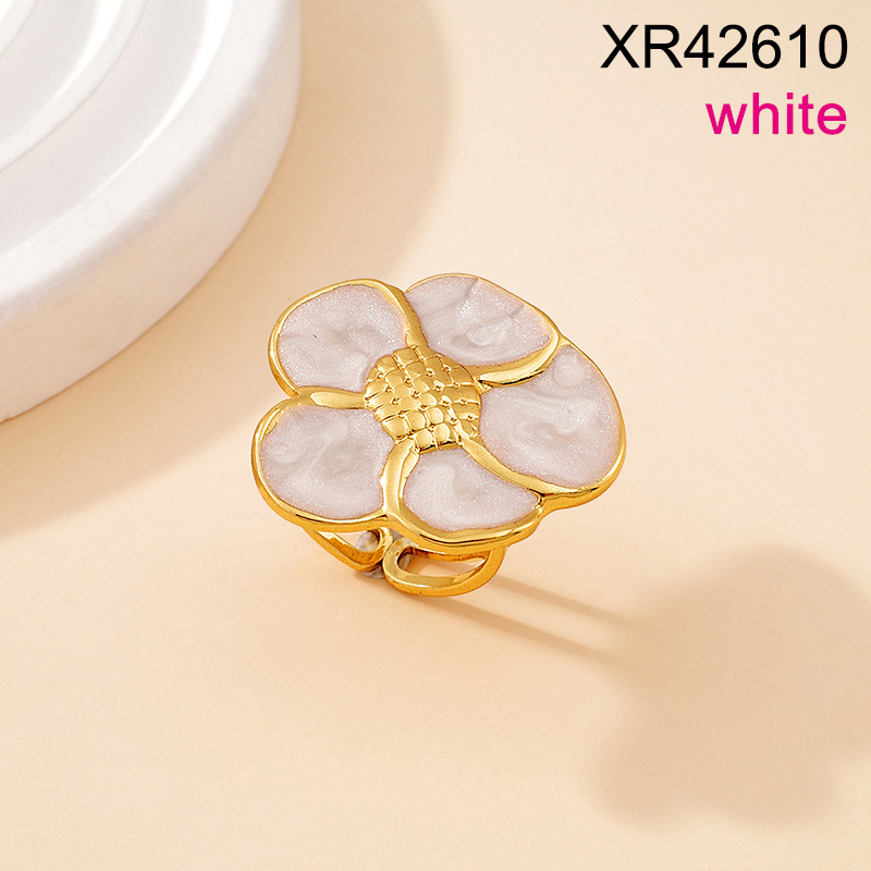 Level B Stainless Steel New Trendy Women Jewelry Drip Oil/Enamel White Flower Golden Open Rings;Ring size can be adjusted freely