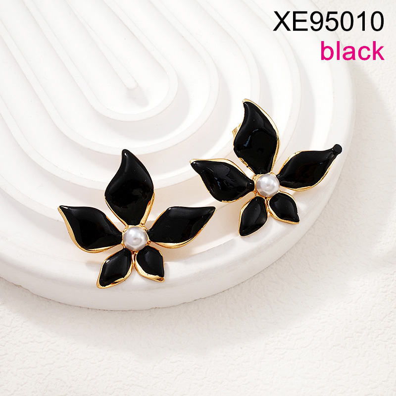 Level B Stainless Steel New Trendy Women Jewelry Pearl Style/Plastic Beads Drip Oil/Enamel Black Flower Golden Earrings