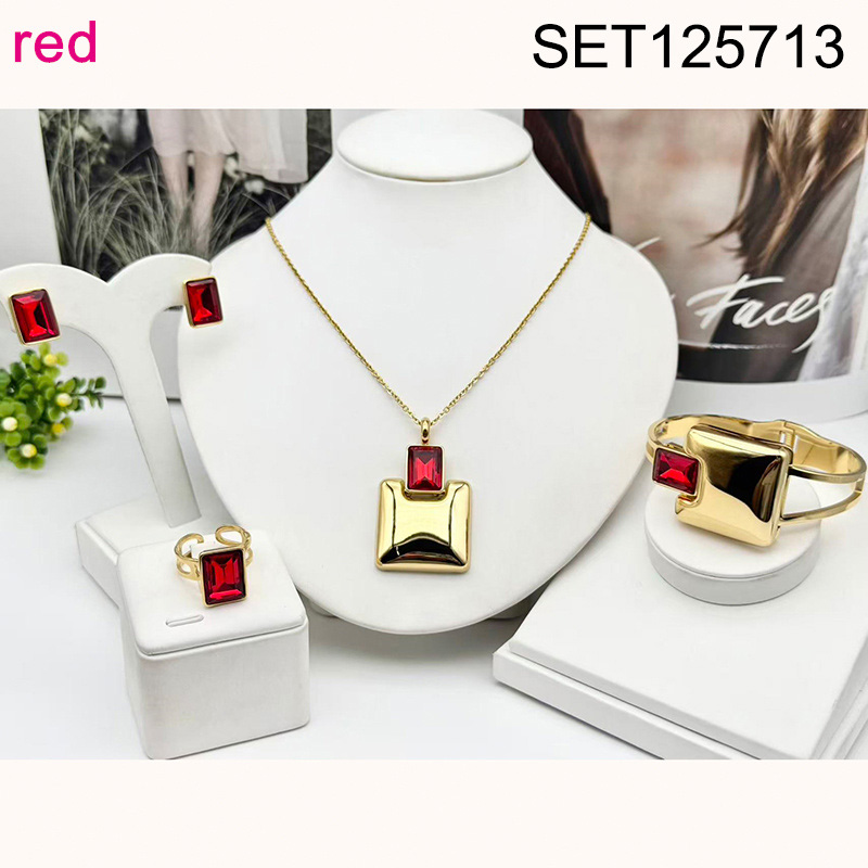 Level B Stainless Steel New Trendy Women Jewelry Red Crystal zirconium Geometry Golden 4pcs SET