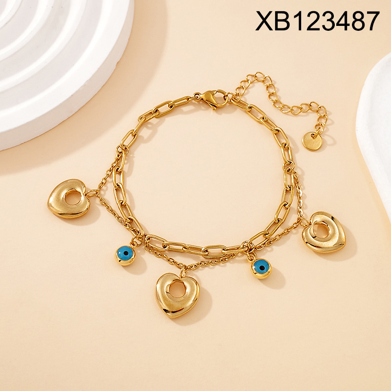 Level B Stainless Steel New Trendy Women Jewelry Two Layers Chain Heart Eye Golden Bracelet