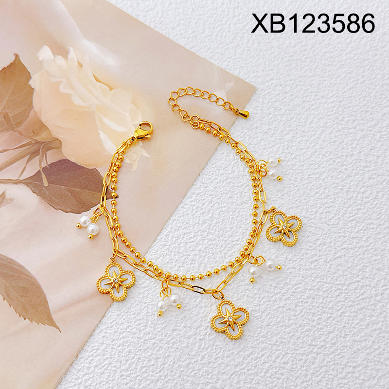 Level B Stainless Steel New Trendy Women Jewelry Pearl Style/Plastic Beads Two Layers Chain SYC Eight-Pointed Star Golden Bracelet